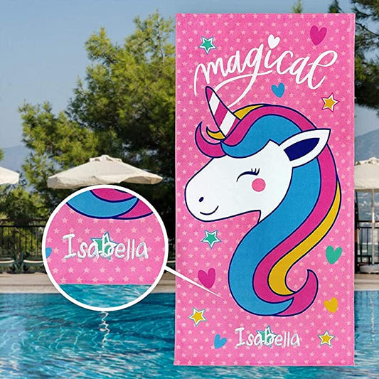 Kaufman - Personalized Printed Beach Towel 100% Absorbent Cotton, 30'' x 60'', Custom Embroidered Name (Magical Unicorn)